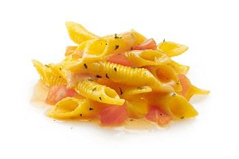 Ingredienti: Ingredienti della pasta 47%: semola di grano duro, farina di grano tenero, uova, acqua, sale. Ingredienti della salsa 53%: salmone affumicato 18%, latte intero, panna, farina di grano tenero, burro, pomodoro disidratato, cipolla, prezzemolo, sale.