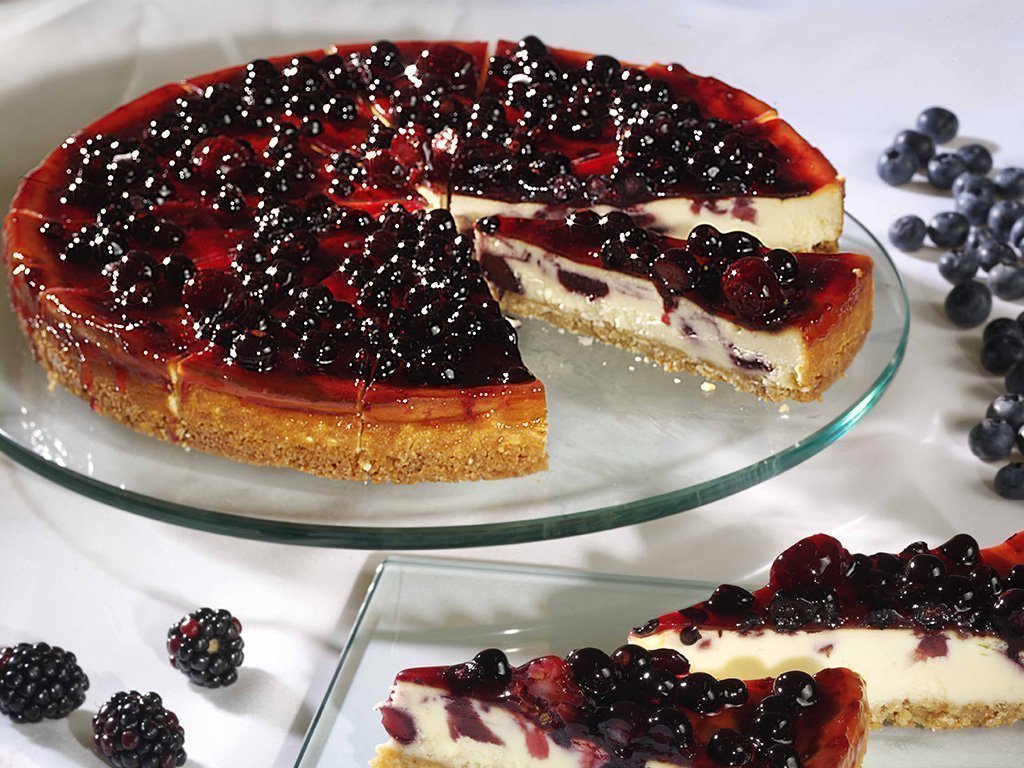 Cheese cake farcita con mousse di ricotta/ decorato con frutti di bosco. Pretagliata in 14 fette.